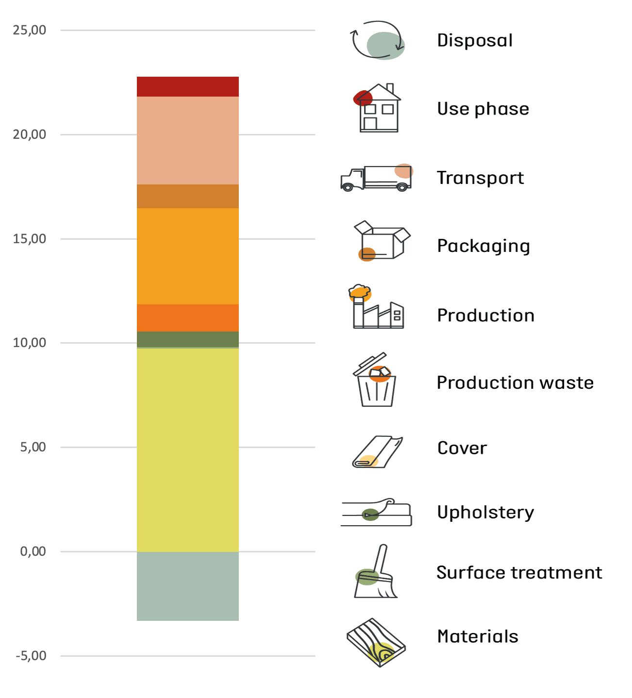 The one with the armrest has a total estimated climate footprint of 19 kg of CO2eq, while the version without the armrest has an estimated total climate footprint of 18 kg of CO2eq.