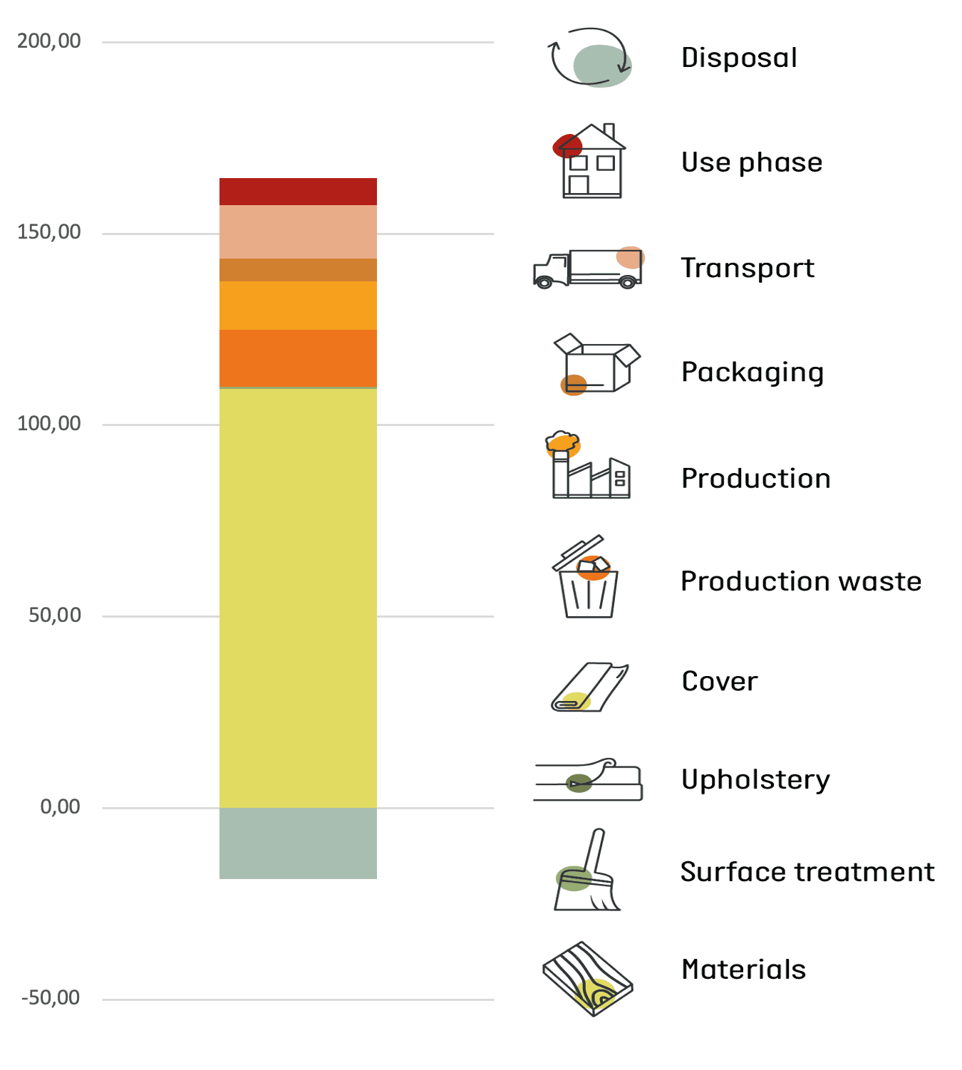 The climate bar shows how the emissions from the design are distributed between 10 sources within the product life cycle. Here you can see that the biggest impact comes from the materials, in this case the aluminum base. However, the design for disassembly allows for the recycling of the metal parts, hence a credit is given. This is illustrated by the part of the climate bar that lies below zero.