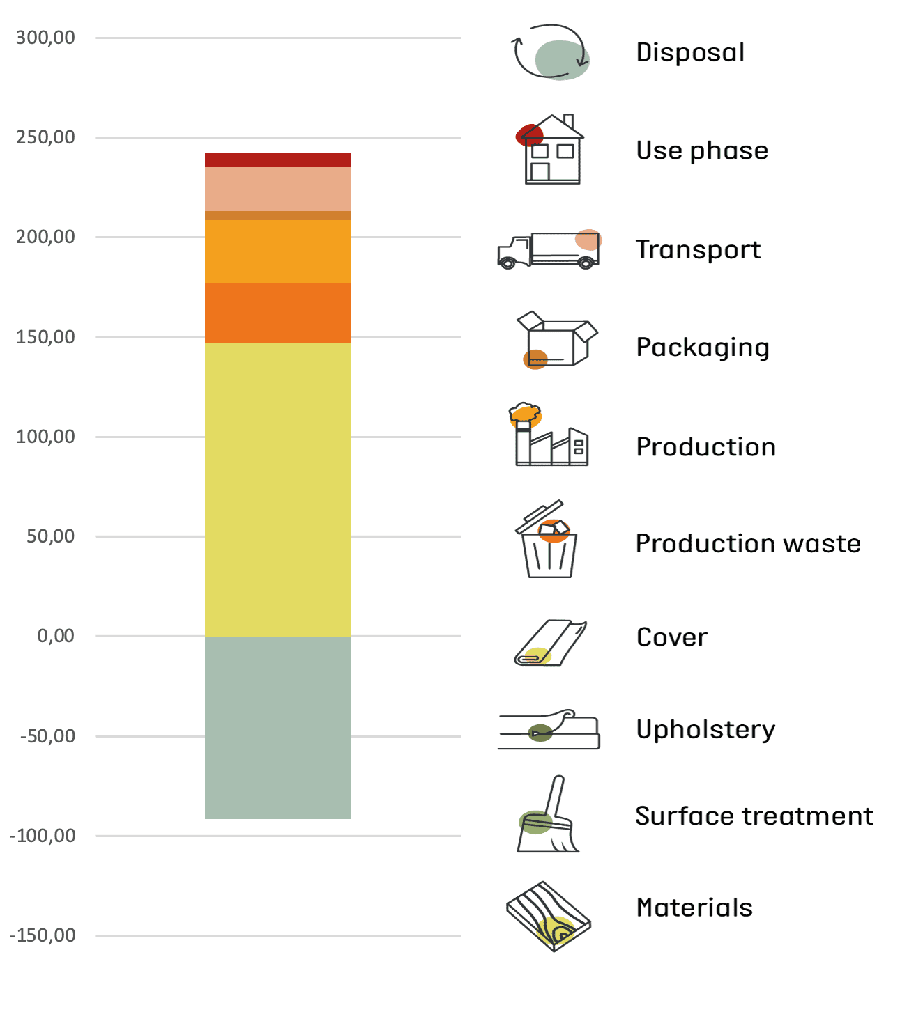 The climate bar shows how the emissions from the design are distributed between 10 sources within the product life cycle. Here you can see that the biggest impact stems from the materials, in this case the metals. However, there is also a noticeable part of the climate bar below zero, which means that 91.6 kg of CO2eq are detracted from the final result. This illustrates the credit given for having designed the metal parts for recycling at end of life by making the component easy to be disassembled from the rest of the materials.