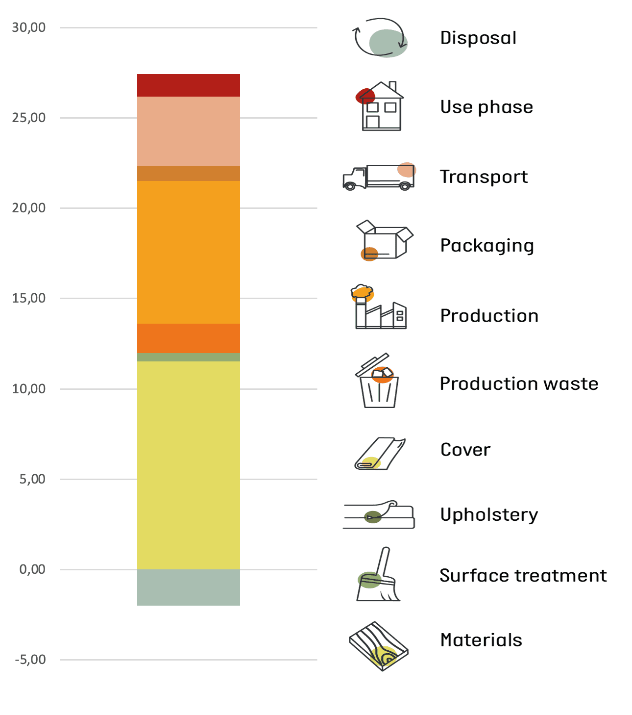 The climate bar shows how the emissions from the design are distributed between 10 sources within the product life cycle. Here you can see that the biggest impacts originate from materials and from production. In this case, it is due to the metal and its manufacturing processes. Furthermore, it is noticeable that a part of the climate bar is below zero. This is the credit given from the recycling of metal at end-of-life, made possible by the design for disassembly. Finally, the transport makes up for a noteworthy part of the emissions, as a lot of air is transported when shipping voluminous products that cannot be flat-packed.