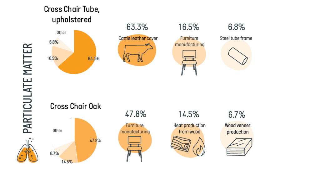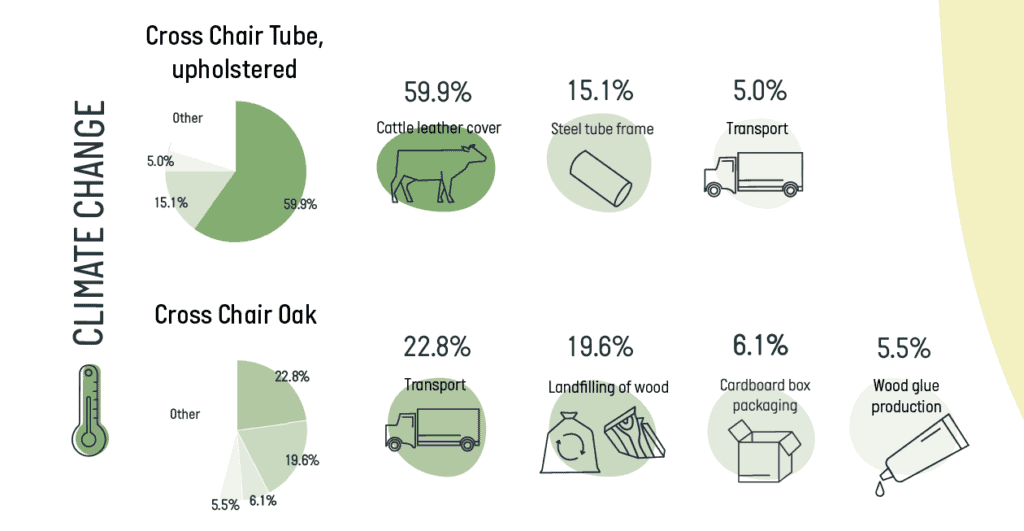 - The leather seat cover represents the dominating impact for the upholstered chair. For climate change, leather alone constitutes 60%.