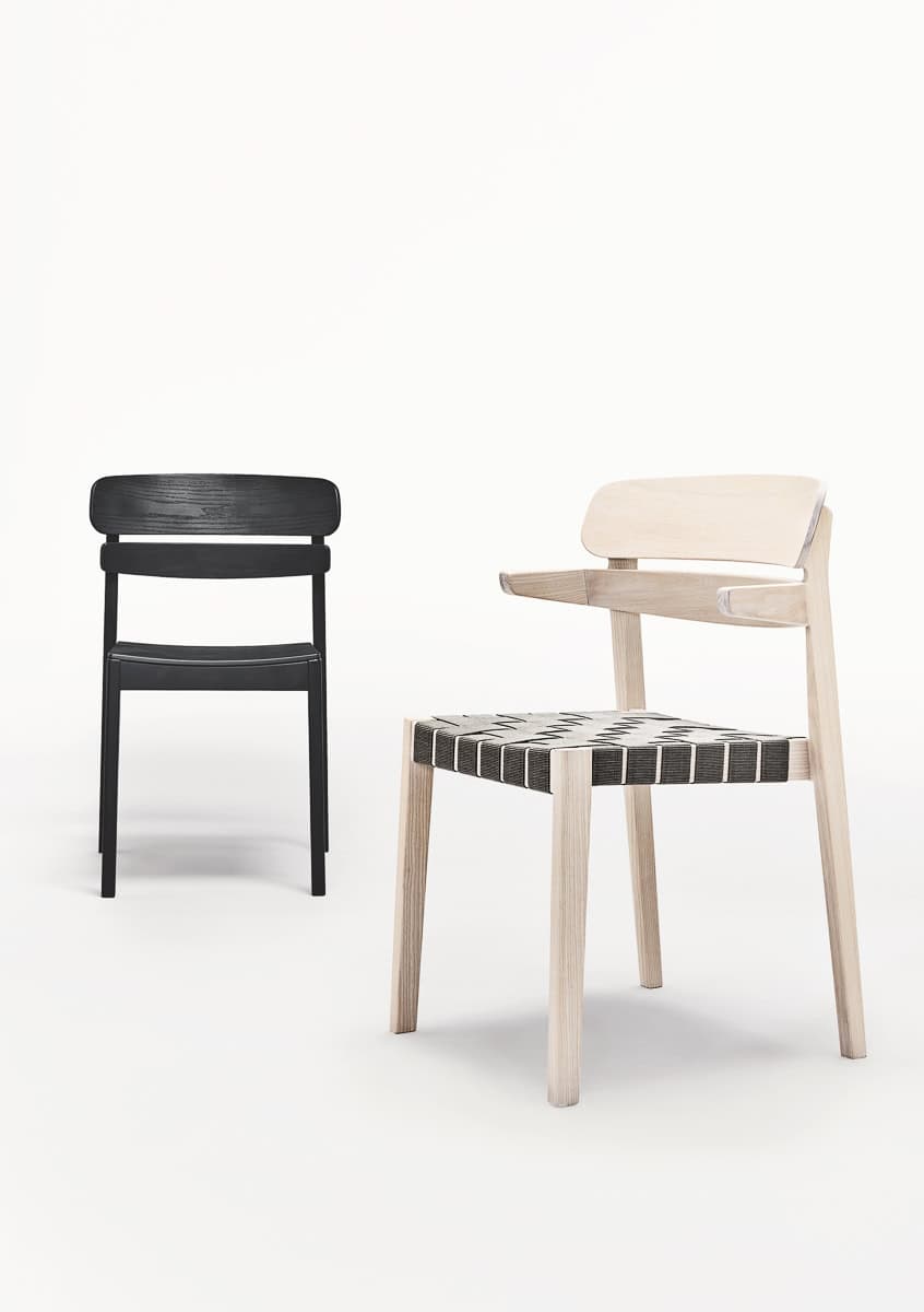 Thomas’ has designed two versions of his dining chair; TEA01 with armrest and woven strap weaving for seat and TEA02 without armrest with wood-based seat and painted with black lacquer.