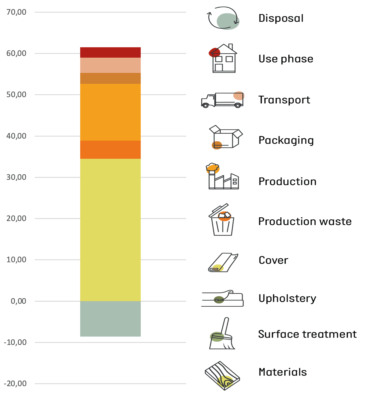 The climate bar shows how the emissions from the design are distributed between 10 sources within the product life cycle. Here you can see that the biggest impact stems from the materials, in this case the metals. However, there is also a noticeable part of the climate bar below zero, which means that 8.6 kg of CO2eq are detracted from the final result. This illustrates the credit given for having designed the metal parts for recycling at end of life by making the component easy to be disassembled from the rest of the materials.